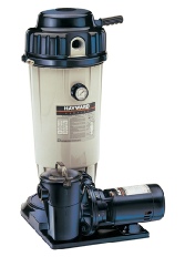 Above Ground Pool Filter - Hayward sand pool filter system with a round filter tank and pump connected by a flexible hose on a shared base.