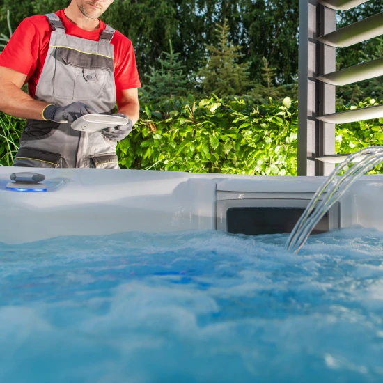 Technician adjusting hot tub controls while water flows from a spa jet on the tub’s edge.